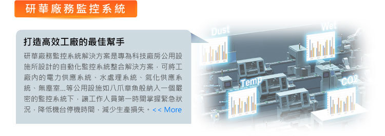 隨著廠房自動化的演進,廠務系統所提供的各項資訊,如溫濕度、廢氣、汙水排放等皆須準確的管控,透過廠務監控系統,將系統運行狀況進行集中監視,智動化追蹤與警示,達成企業提升管理效率、降低控管成本的目標。