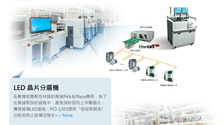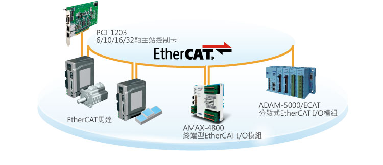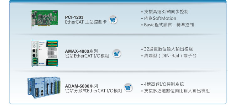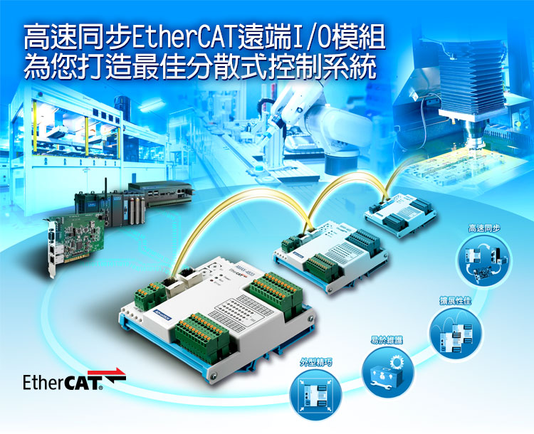 研華EtherCAT解決方案提供主站與從站全系列產品,支援多家EtherCAT伺服/步進馬達,不須ESI檔案自動搜尋並連接EtherCAT網路所有站點,提升整廠配線的效率